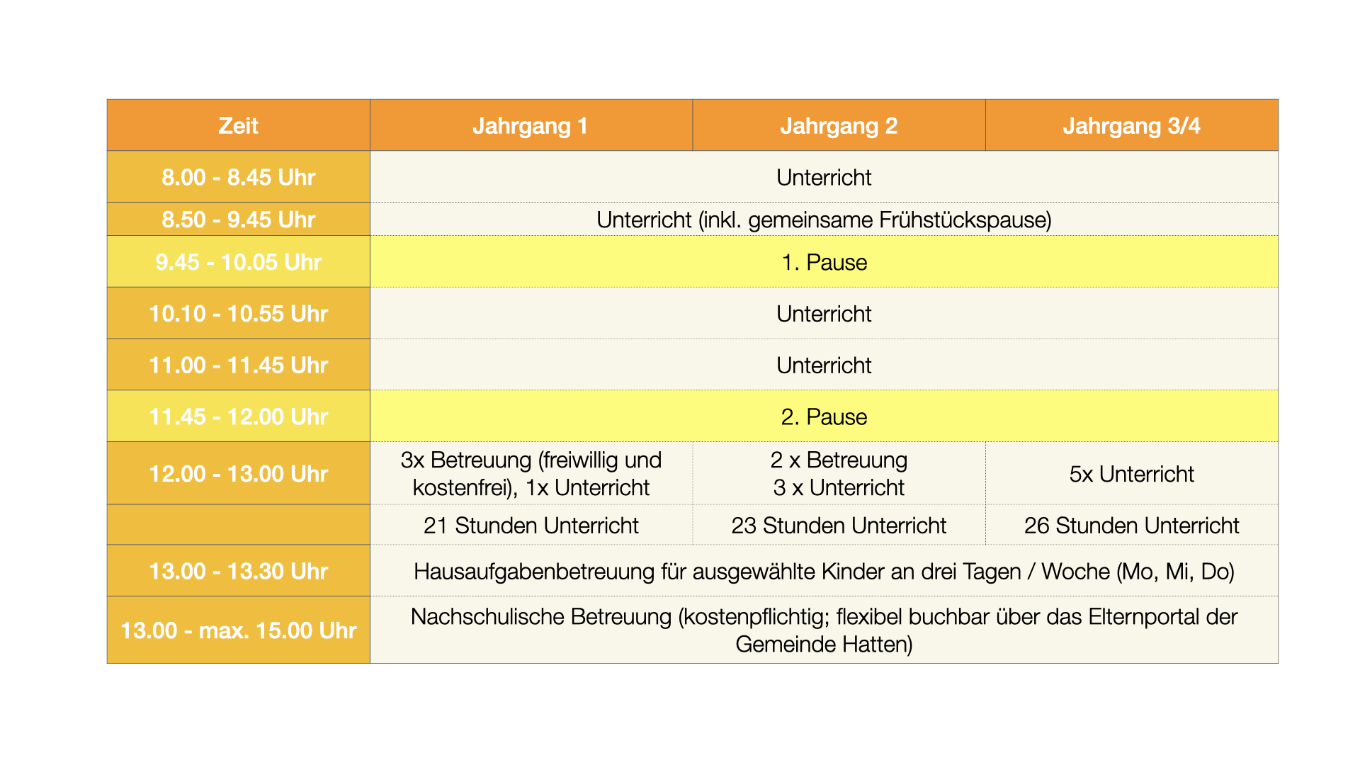 Als verlässliche Grundschule stellen wir ein täglich mindestens fünf Zeitstunden umfassendes Schulangebot sicher.